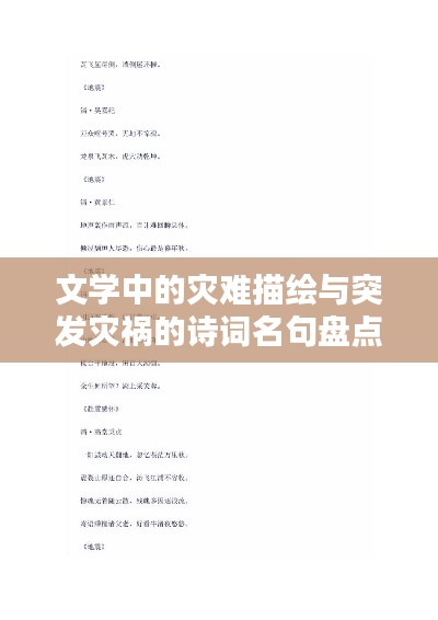 在文學(xué)的長河中,詩人們常常借助詩詞名句來抒發(fā)內(nèi)心的情感,表達(dá)對(duì)世界的理解和對(duì)生活的體驗(yàn),突發(fā)災(zāi)禍作為人生不可避免的一部分,也成為了詩人們創(chuàng)作的靈感來源之一,以下是一些關(guān)于突發(fā)災(zāi)禍的詩詞名句,它們反映了詩人們對(duì)災(zāi)難的深刻理解和感受。