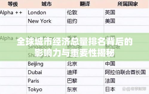 隨著全球化的不斷深入,城市經(jīng)濟(jì)已經(jīng)成為國家經(jīng)濟(jì)發(fā)展的重要支柱,經(jīng)濟(jì)總量在世界排名城市的位置,不僅代表了該城市的經(jīng)濟(jì)實(shí)力,也反映了其在全球舞臺上的影響力,本文將從經(jīng)濟(jì)總量在世界排名城市的含義、影響以及未來發(fā)展等方面進(jìn)行探討。